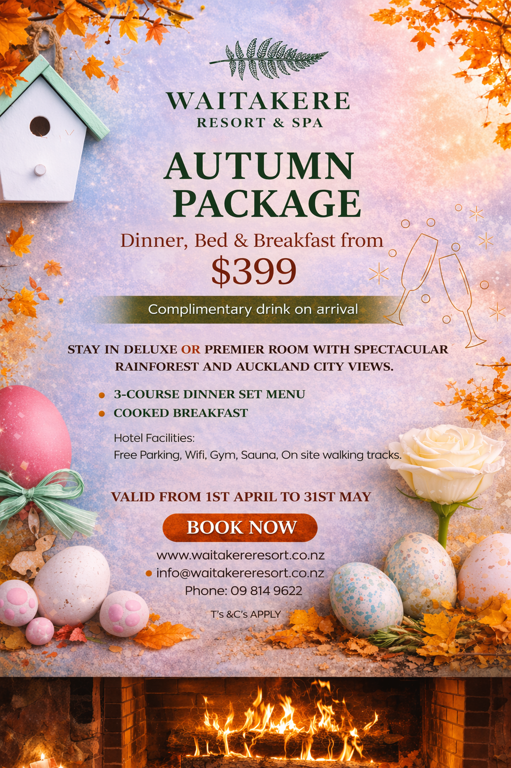 Escape to the tranquillity of the Waitākere Ranges with our exclusive Autumn & Easter Package at the best resort in Auckland with amazing city and rainforest view.